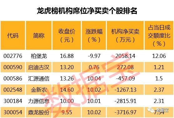 此外,机构净卖出居前个股分别为鼎龙股份、力源信息、金新农等,净卖出金额占当日成交额比例达7.54%、2.31%、2.37%。