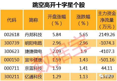 在昨日所有交易个股K线图中,两市共有6只个股日K线出现跳空高开十字星形态,当天涨幅较大的是丹邦科技、明阳电路、捷捷微电,涨幅分别为5.65%、2.96%、1.9%。