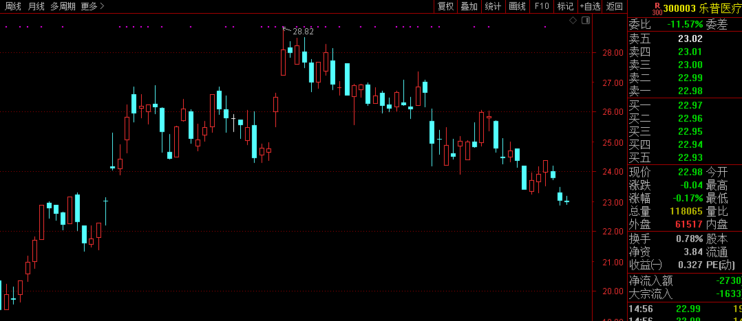 乐普医疗近期跌跌不休,最新收盘价创本轮调整行情以来新低。自4月8日以来,市场各大指数开始调整,沪指累计下跌10.72%,乐普医疗股价呈下跌走势,期间累计下跌16.87%,跌幅超过同期沪指。
