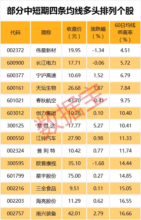 最新数据显示,两市有26只个股5日、10日、20日、60日四条均线近日呈多头排列。其中伟星新材、长江电力、宁沪高速股价与60日均线的乖离率最小,分别为4.51%、5.72%、6.79%。