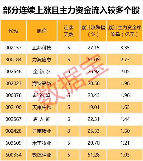 值得注意的是,222只连续上涨个股中,10只个股期间主力资金累计净流入超过亿元。其中,累计资金流入最多的为正邦科技,主力资金累计流入3.35亿元。