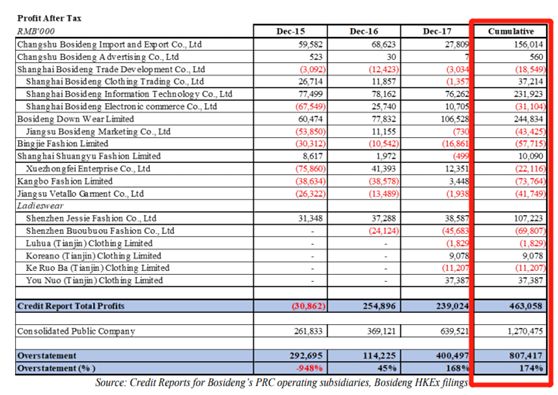 Bonitas就其在香港交易所的文件中披露的波司登中国主要营运附属公司的每一份报告,和波司登报告的综合财务表现与各自主要营运附属公司向中国政府报告的情况作比较,得到以下信息: