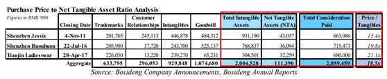 下表突显了波司登收购中出现的共性:波司登似乎已经为周先生收购的企业支付了人为高价15倍至21倍的净有形资产,其资产为95%无形资产,并且慷慨地赠送周先生的三年内高达4000%的回报。