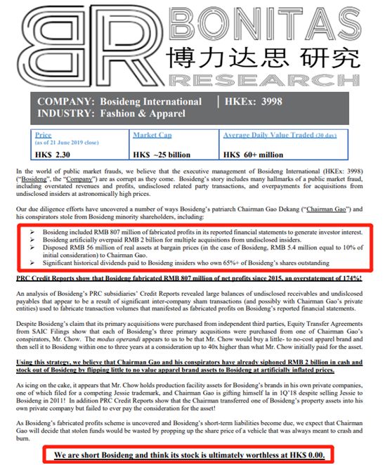6月24日上午10点,沽空机构BONITAS发表沽空报告,指控波司登在公开市场造假,夸大收入及盈利等,报告指,该股完全没有价值,给予零元。