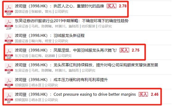 国信证券6月18日发布研报指出,波司登行业龙头地位稳固,改革红利持续释放,给予“买入”。其认为,在需求升级供给出清推动行业集中度稳步提升趋势下,波司登通过多年来积累的研发生产和品牌资源,以产品升级及供应链优化为抓手,大力推进品牌重塑有效把握年轻化消费升级趋势,有望持续实现基本面复苏。预计FY19-21年EPS为0.08/0.11/0.14元,对应PE分别为21.9/16.4/13.3倍。综合考虑绝对估值及相对估值,给予公司一年内合理估值区间2.57-2.78港元,集团行业龙头地位稳固,品牌改革红利有望持续释放,给予“买入”评级。