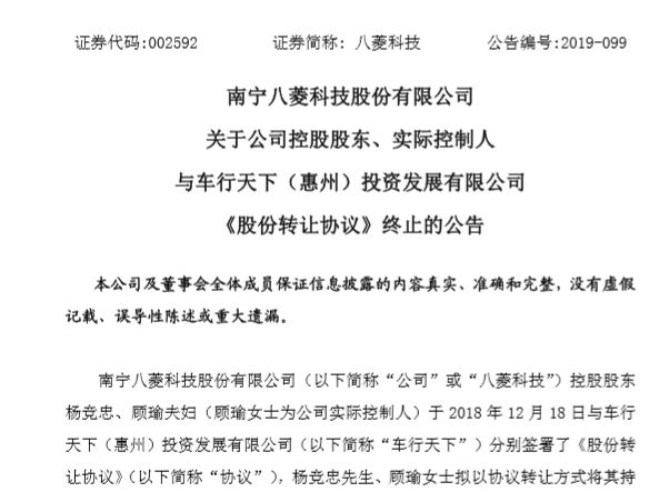 不过这笔11.33亿元的股权转让计划同样无疾而终,2018年12月18日八菱科技称,由于两个月有效期后双方都未续期以及未签订正式的转让协议,意向协议自动终止。然而,就在终止与南京红太阳股权交易的同一天,八菱科技便又宣布了与车行天下的股权转让意向。八菱科技工作人员称:“双方当初只是意向协议,后边并未签署正式的股权转让协议。”