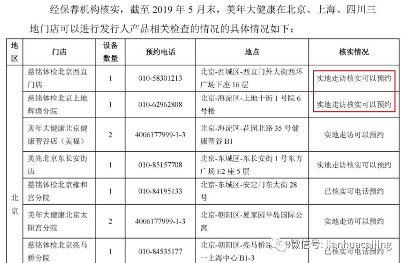 安翰科技列举了美年大健康在北京、上海、四川三地共计64家门店的电话、地址及核实情况,表示媒体质疑结果与事实不符,根据安翰科技回复显示情况,安翰科技保荐机构共对14家美年健康门店进行了实地走访。保荐机构认为美年大健康及其加盟店开展安翰科技产品相关检查情况不存在异常,两者之间的交易合理。