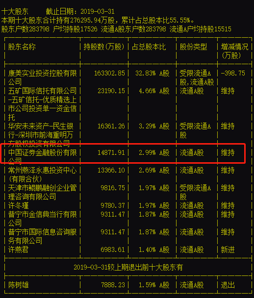 而ST康美2018年年报显示,证金公司持有约1.49亿股,今年一季报证金公司持股数量没有发生变化。两资产管理计划一季度应该是从市场买入,而不是证金公司划拨。截至一季报,证金公司直接与间接持有ST康美高达约2.54亿股。