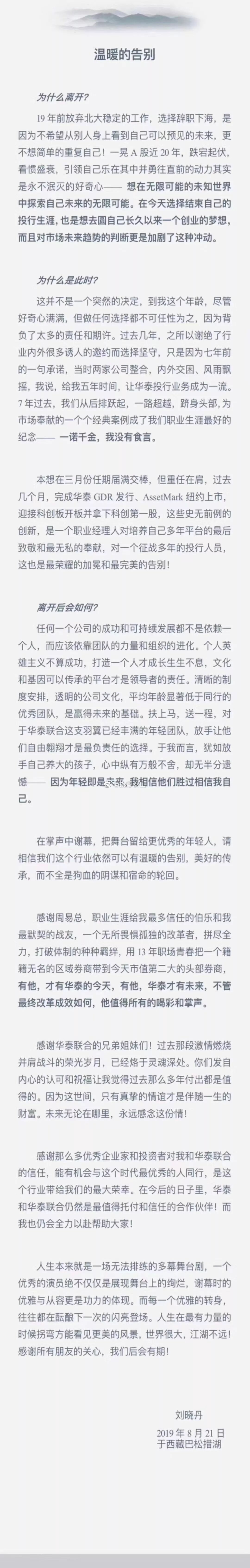 同日,刘晓丹从西藏发出一封告别信,在解释离职原因时表示,“想在无限可能的未知世界中探索自己未来的无限可能。在今天选择结束自己的投行生涯,也是想去圆自己长久以来一个创业的梦想,而且对市场未来趋势的判断更是加剧了这种冲动。”