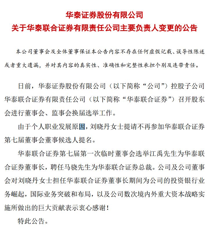 华泰证券公告称,公司及公司董事会对刘晓丹女士担任华泰联合证券董事长期间为公司的投资银行业 务崛起,国际业务突破和布局,以及公司数次境内外重大资本战略实 施所做出的巨大贡献表示衷心感谢!