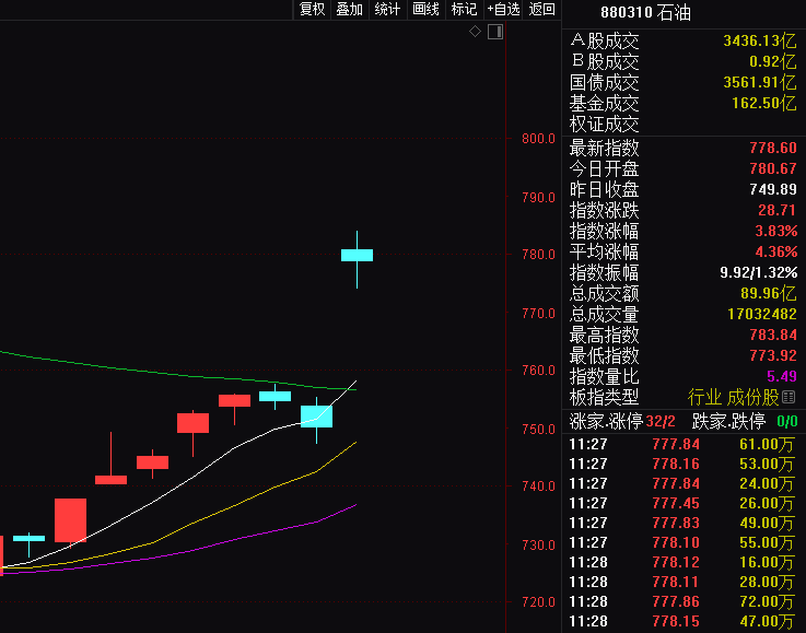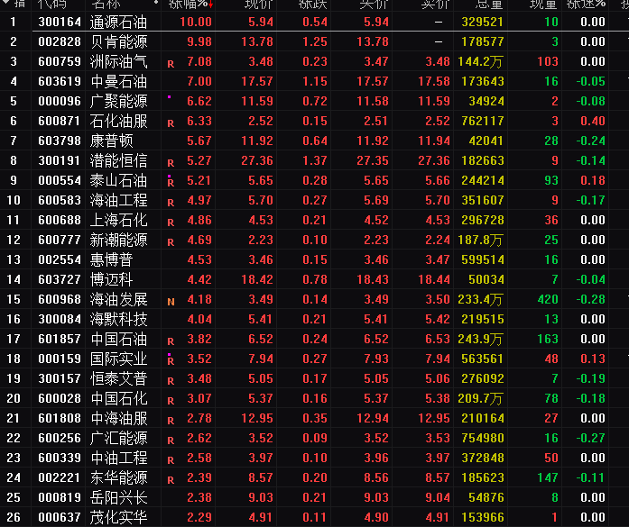 石油股随即集体高开,石油板块指数一度上涨逾6%,后受短期获利回吐影响,略有回撤,截至发稿仍涨3.8%。洲际油气、通源石油、贝肯能源等7股开盘涨停,但随后也陆续打开涨停板,截至发稿,只通源石油、贝肯能源2股封住涨停,中国石油高开低走涨3.82%。据统计,早盘A股石油板块市值飙升618亿。