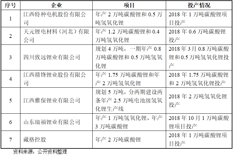 2015年第四季度至2018年初,受益于新能源汽车行业迅速发展等因素影响,下游市场对锂化工产品的需求呈现爆发性增长。近年来生产企业加快扩产,供需关系格局逐渐改变,产品售价出现明显回调。2015年四季度以来的锂产品价格大幅上涨刺激生产企业加快扩产计划,相关产品新增产能逐渐增加。考虑到锂化合物新建及扩产项目自建设至投产一般需要2~3年时间,行业产能自2018年以来相对集中释放。