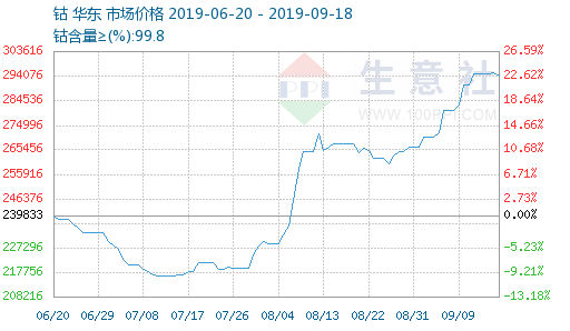 “从9月6日开始,到9月10日的三个交易日内,钴价均价上涨近两万元。截至9月10日,钴价报价29.1万元/吨,较9月5日钴价报价均价27.2万元/吨,三个交易日钴价上涨1.9万元/吨,涨幅6.99%。”生意社分析师白家新称。