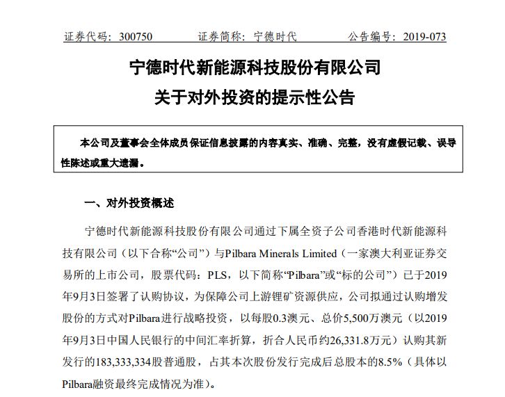 9月4日宁德时代公告称,公司通过下属全资子公司香港时代新能源科技有限公司与Pilbara Minerals Limited(一家澳大利亚证券交易所的上市公司)已于2019年9月3日签署了认购协议,为保障公司上游锂矿资源供应,公司拟通过认购增发股份的方式对Pilbara进行战略投资,以每股0.3澳元、总价5500万澳元(折合人民币约2.63亿元)认购其新发行的1.83亿股普通股,占其本次股份发行完成后总股本的8.5%(具体以Pilbara融资最终完成情况为准)。