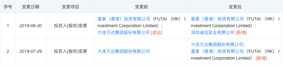7月29日,万达地产发生了投资人和注册资本变更,引入新股东富泰(香港)投资有限公司,后者出资5263万元,持股比例为5%。万达地产集团由此变更为中外合资有限公司。