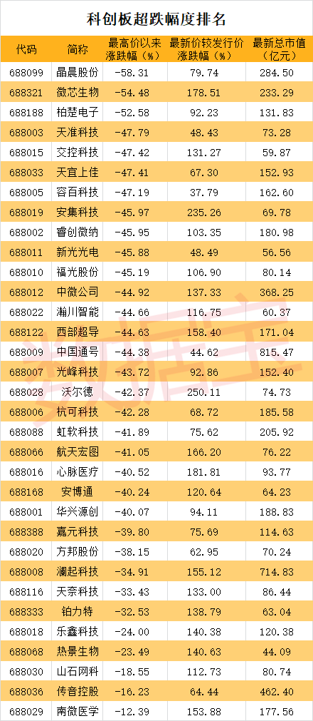数据宝统计显示,已经有3家科创板公司最新价较历史高点下跌超过50%。其中,晶晨股份上市首日一度涨到166元,最新价仅69.2元,下跌超过58%位居首位。微芯生物上市首日一度涨至125元,现价仅56.9元,折价超过54%位居次席。柏楚电子上市首日一度涨至278元,现价不到132元,折价超过52%位居第三位。