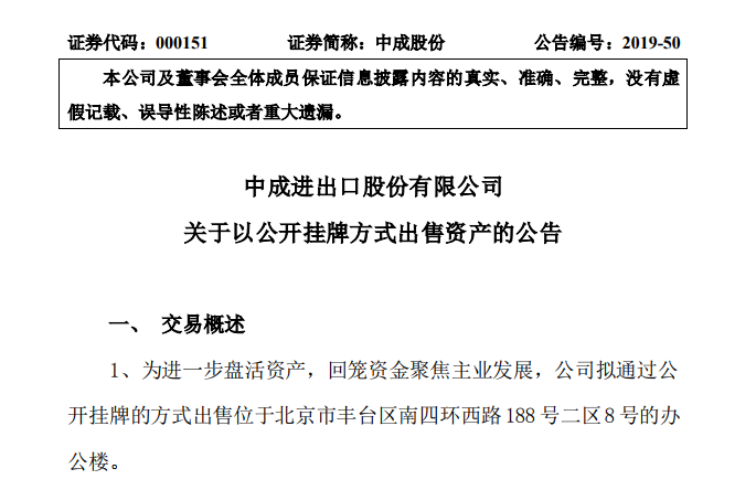 10月22日晚间,中成股份公告称,公司第七届董事会第十九次会议全票通过了《关于以公开挂牌方式出售资产的议案》。