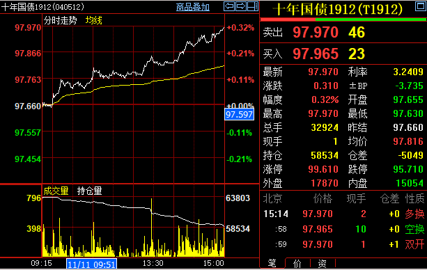 同时,11月11日,国债期货全线收涨,10年期主力合约T1912合约上涨0.32%,5年期主力合约涨0.16%。
