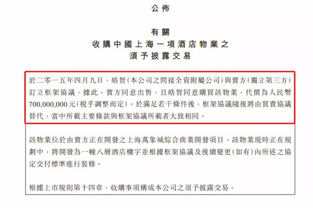 2015年4月以7亿元的代价从华润置地手中买下上海闵行万象城中的一栋8层酒店楼宇。拟将该项目打造成为包括约7万平方米办公物业、约1.4万平方米商业零售区域、约2万平方米酒店物业以及约3万平方米综合文化演艺设施的项目。