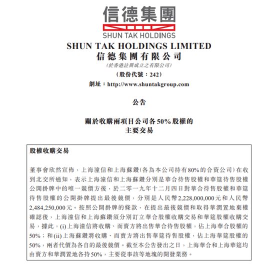 公告显示,信德集团分别持股80%的两家合资公司:上海潼信和上海苏钻作为唯一竞价方,拍下上海华合、上海华筵各自50%的股权,受让价格分别为22.28亿元和24.84亿元。转让完成后,苏河湾地块将由华润置地和信德分别持股50%。