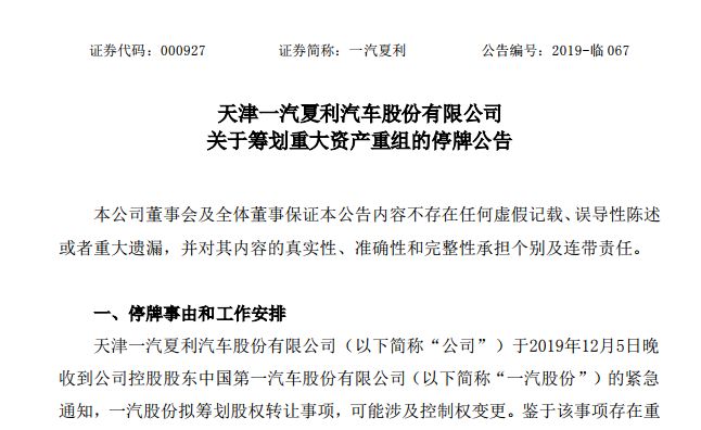 12月6日早盘,因一汽股份拟筹划股权转让事项,可能涉及控制权变更,一汽夏利股票临时停牌。8日晚间,随着一汽夏利的一纸公告,上述事项的脉络也逐渐浮出水面。