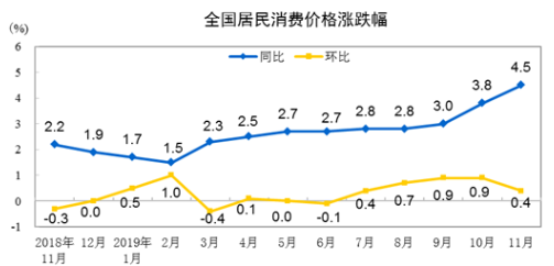 国家统计局今天发布数据,11月全国CPI(居民消费价格指数)同比上涨4.5%,环比上涨0.4%,高于预期和前值,时隔七年后再次迈入“4时代”。PPI(工业生产者出厂价格指数)同比下降1.4%,降幅收窄。CPI和PPI的“剪刀差”进一步扩大。