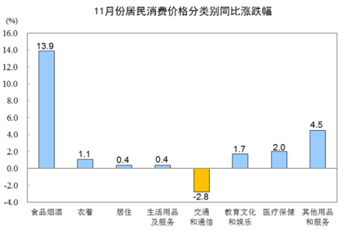 分类别来看,11月份食品烟酒类价格同比上涨13.9%,影响CPI上涨约4.1个百分点,其中猪肉价格上涨110.2%,影响CPI上涨约2.64个百分点。11月虽然猪肉价格出现了下降,但其价格仍位于高位。