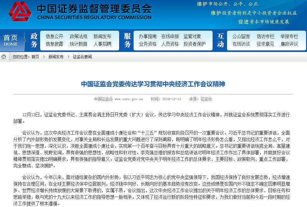 会议强调,证监会党委和系统各单位党委要结合当前正在开展的学习贯彻党的十九届四中全会精神,把学习好、贯彻好中央经济工作会议精神作为一项重要任务抓紧抓实,自觉坚持和加强党对资本市场工作的全面领导,增强“四个意识”,坚定“四个自信”,做到“两个维护”,切实把思想和行动统一到党中央关于经济工作的部署要求上来,切实把党的领导的制度优势转化为治理效能。