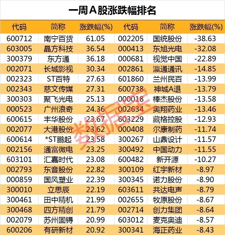 证券时报·数据宝统计显示,剔除今年上市次新股,南宁百货本周累计涨幅61.05%遥遥领先,晶方科技累计涨幅排名第二位,东方通排名第三位。涨幅靠前的还有长城影视、ST百特、慈文传媒、聚飞光电、广州浪奇等。