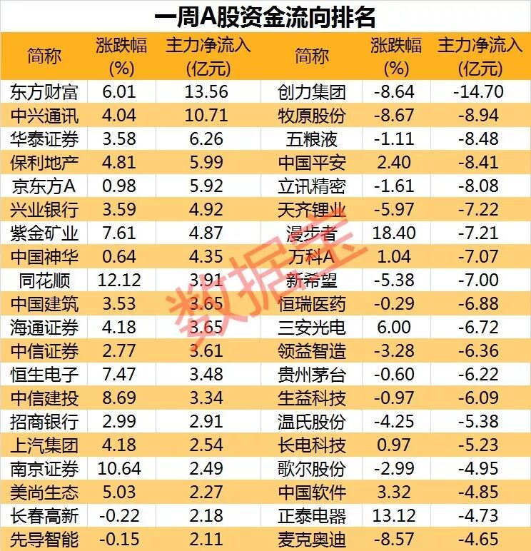 个股方面,本周共22股主力资金净流入超2亿元。东方财富主力资金净流入13.56亿元,获主力资金流入力度最大,该股本周上涨6.01%;中兴通讯获主力资金净流入有10.71亿元,本周上涨4.04%。