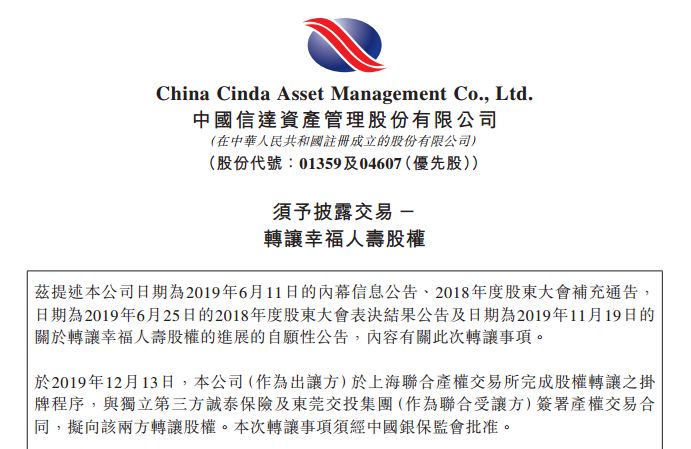 12月13日,诚泰保险及东莞交投集团作为联合受让方,与中国信达签订产权交易合同,受让信达所持50.995%幸福人寿股权,总对价75亿元,也就是以挂牌底价成交。