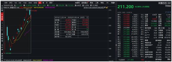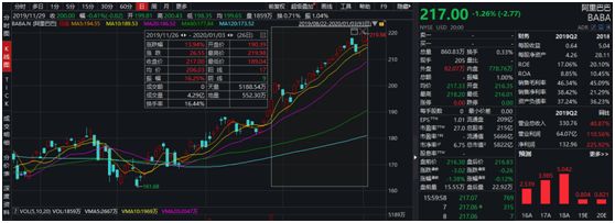 2019年11月26日,阿里巴巴在香港二次上市。截至2020年1月6日收盘,阿里巴巴港股已累计涨幅超过20%。在港股强劲走势带动下,阿里巴巴美股屡创新高,自2019年11月26日以来,阿里巴巴美股累计上涨13.94%,美股总市值5822亿美元。
