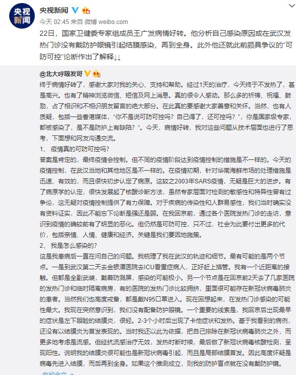 据央视报道,22日,国家卫健委专家组成员王广发病情好转。他分析自己感染原因或在武汉发热门诊没有戴防护眼镜引起结膜感染,再到全身。此外他还就此前颇具争议的“可防可控”论断作出了解释。