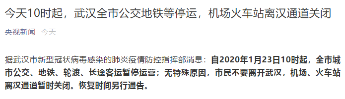 自2020年1月23日10时起,全市城市公交、地铁、轮渡、长途客运暂停运营;无特殊原因,市民不要离开武汉,机场、火车站离汉通道暂时关闭。恢复时间另行通告。