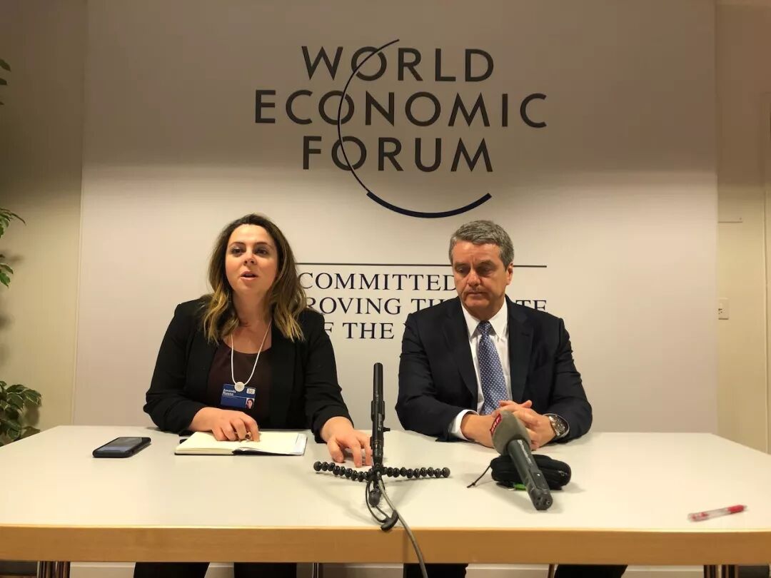 当地时间1月22日下午,世贸组织总干事阿泽维多(Roberto Azevedo)在世界经济论坛年会现场召开小型记者会。