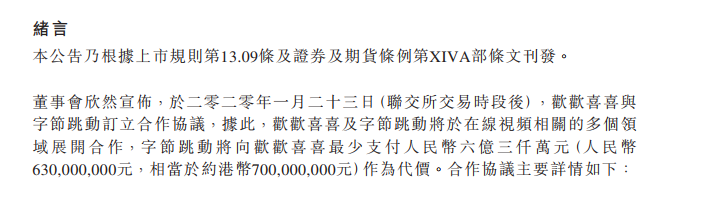 同时,欢喜传媒全资附属公司欢欢喜喜与字节跳动订立合作协议,据此,欢欢喜喜及字节跳动将于在线视频相关的多个领域展开合作,字节跳动将向欢欢喜喜最少支付6.3亿元作为代价。