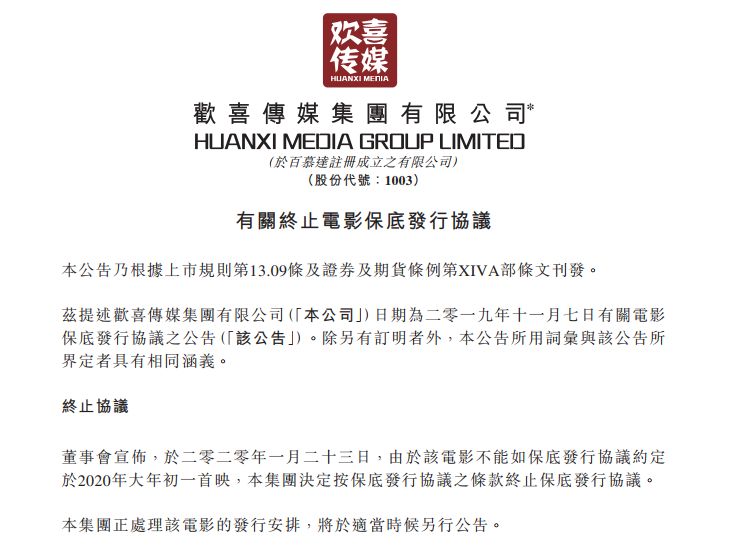 欢喜传媒今早公告称,与字节跳动订立合作协议,终止电影《囧妈》保底发行协议。