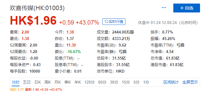 今日,《囧妈》出品方港股欢喜传媒直线拉升,截至午间收盘,股价暴涨43%。