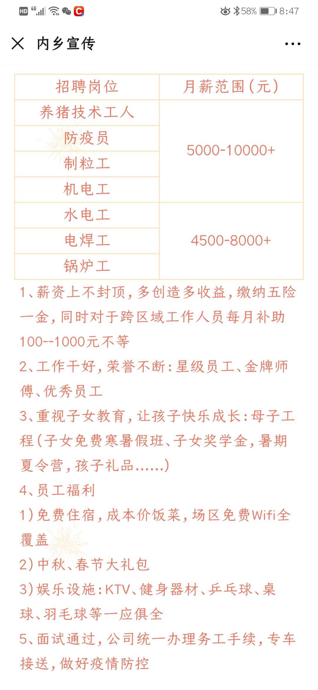 据悉,2020年春节期间,牧原集团已运用科技手段迅速转变招聘模式,通过线上宣讲、视频面试,让应聘者用一部手机找到心仪工作。此番公司将继续面向内乡县再提供2万个就业岗位,包括养猪技术工人、防疫员等,月薪5000元至10000+不等,并表示薪资上不封顶,对于跨区域工作人员每月补助100至1000元不等,此外还有免费住宿、KTV娱乐提供。面试通过,公司将统一办理务工手续,专车接送,做好疫情防控。