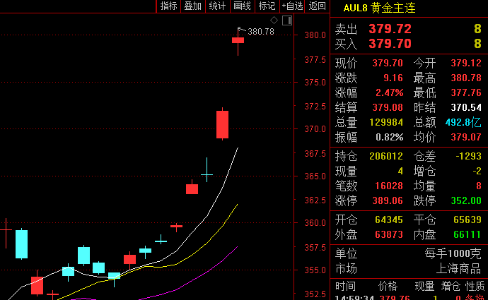 24日,国内期货市场上沪金同样保持领涨态势。早盘沪金主力合约一度冲抵380.78元/克,刷新2011年9月以来新高,截至下午收盘报涨2.47%。2月13日以来,沪金主力合约累计最大涨幅已近8%,而自2019年11月以来,该主力合约累计最大涨幅已近15%。