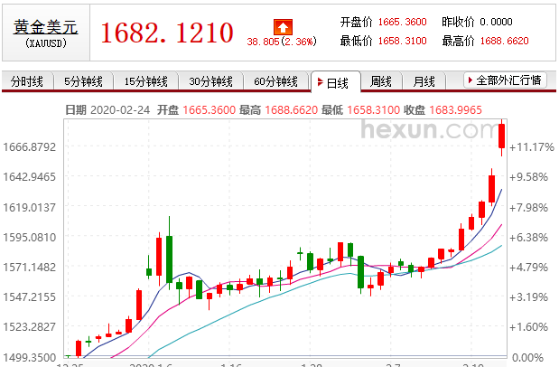 继上周金价突破千六关口,大幅攀升接近60美元后,2月24日,国际金价开盘突破1660美元关口,早间一度暴涨近40美元,盘中最高上至1680.1美元/盎司一线,日内涨幅超过2%,后金价回吐部分涨幅,报1665美元/盎司附近,日内涨幅依然超过20美元。随后,现货黄金重回1680美元/盎司上方,报1682.83美元/盎司,日内涨约2.4%。