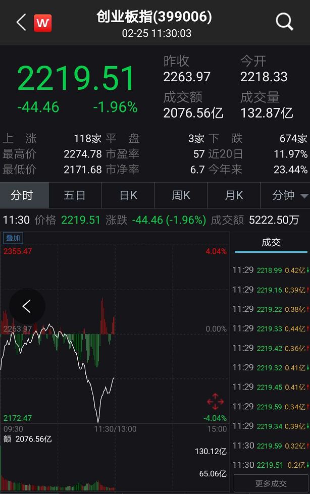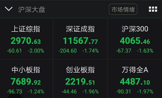 截至午盘收盘,上证指数跌2.00%,深证成指跌1.74%,创业板指跌1.96%。