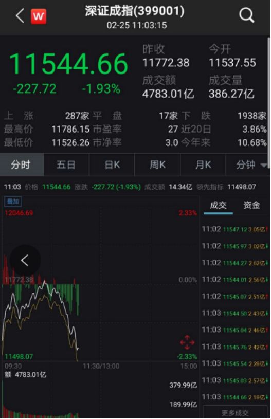 深证成指从跌幅2%迅速收窄至0.1.%,随后指数翻红。但随后指数走低,截至11点左右,深证成指跌幅1.93%。