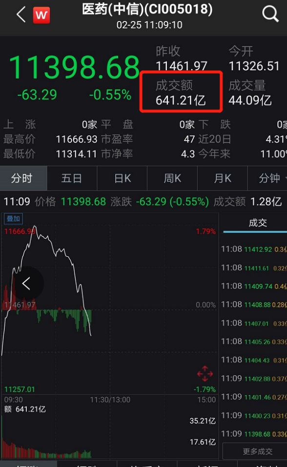 从行业板块看,医药股指数盘中涨超1.79%,随后指数下跌,截至11点左右,医药板块成交破600亿。