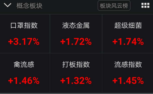 受海外疫情病例大幅扩散影响,全球各地对疫情的恐慌度提升,A股疫情相关概念板块也随之大涨。其中口罩股全线大涨,超级细菌、流感指数、肺炎指数等涨幅居前。