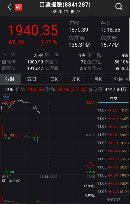 2月25日开盘,口罩概念指数大幅高开,不惧外围市场利空,盘中一度涨幅超5%。截至11点10分左右,口罩指数涨幅高达3.7%。