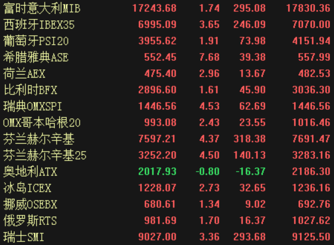 欧洲股市方面,周三英国富时100指数涨4.45%,德国DAX30指数上涨1.79%,法国CAC40指数上涨4.47%,欧洲斯托克50指数上涨2.60%。