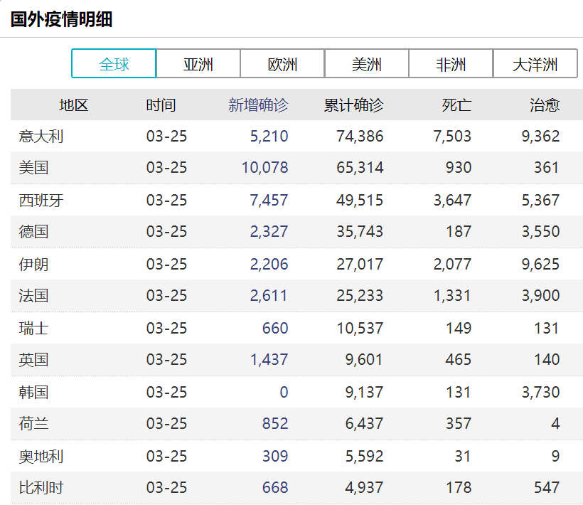 数据显示,目前,中国以外新冠肺炎确诊人数最多的国家为:意大利74386例,美国65314例,西班牙49515例,德国35743例。