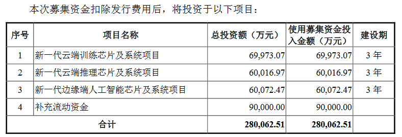 分别投资于新一代云端训练芯片及系统项目约7亿元,投资于新一代云端推理芯片及系统项目约6亿元,投资于新一代边缘端人工智能芯片及系统项目约6亿元,用于补充流动资金约9亿元。