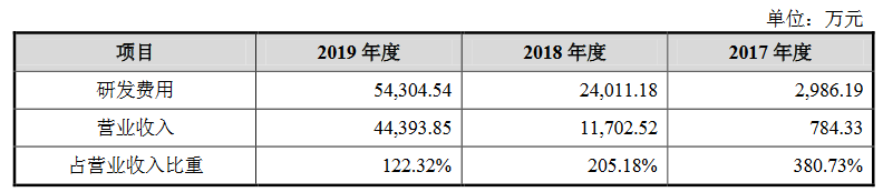 作为科技企业,寒武纪保持了较高的研发投入。2017年、2018年和2019年,公司研发费用分别为2986.19万元、24011.18万元和54304.54万元,研发费用率分别为380.73%、205.18%和122.32%。